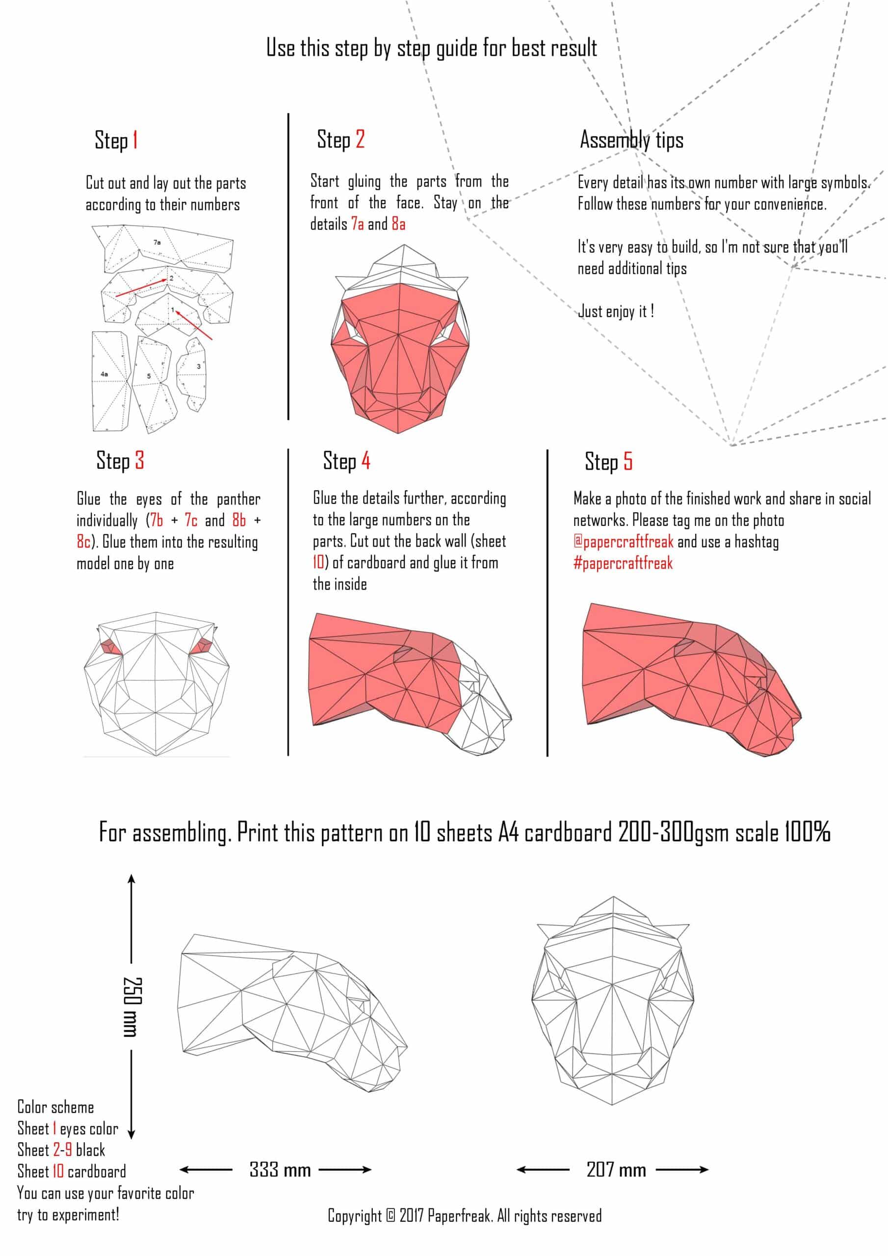 Embarquez dans l’aventure créative et détendez-vous en assemblant cette panthère en papercraft 3D. Suivez les étapes faciles : découpez les pièces numérotées, commencez par le visage, puis ajoutez les yeux et continuez à coller selon les numéros. La satisfaction de voir la panthère prendre forme sous vos mains est incomparable. Prenez une photo de votre chef-d’œuvre et partagez-la sur les réseaux sociaux avec le hashtag #paperfreak. Vous allez adorer montrer votre talent artistique !