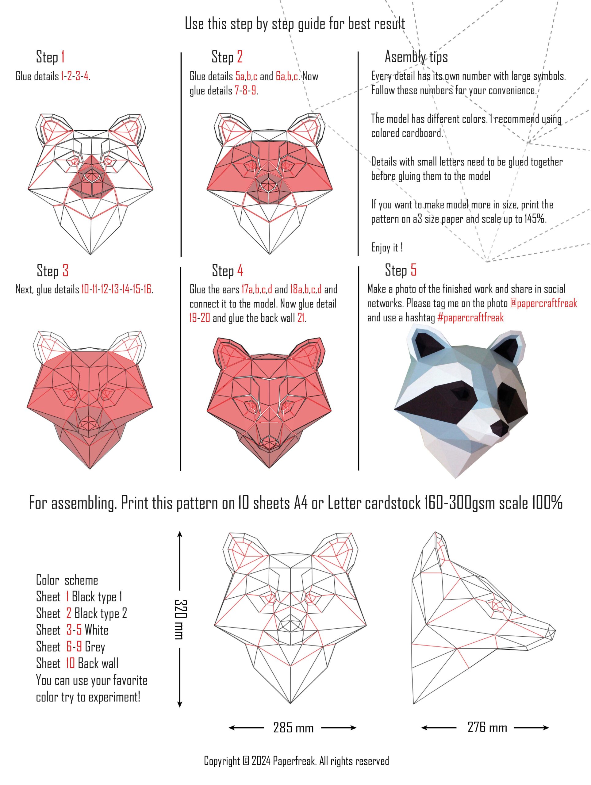 Laissez libre cours à votre créativité et amusez-vous à assembler le papercraft de tête de raton laveur en origami 3D. Suivez les instructions détaillées incluses dans le modèle et partagez votre œuvre sur les réseaux sociaux avec le hashtag #papercraftfreak. Que vous soyez un amateur de loisirs créatifs ou un décorateur passionné, ce projet est fait pour vous !
