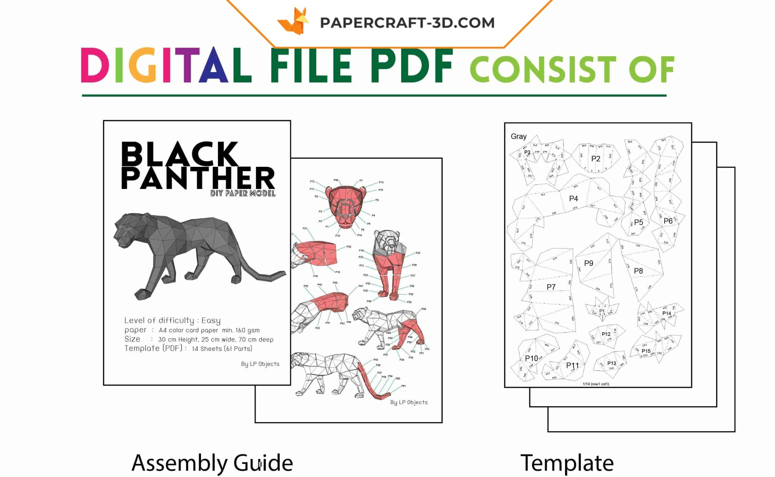 Cette sculpture papier se déploie majestueusement sur 70 cm de long, se dresse à 30 cm de haut et s’étale sur 25 cm de large. Le modèle utilise des feuilles de papier cartonné A4 de 160 à 300 gsm, garantissant résistance et durabilité. Votre papercraft de panthère noire sera constitué de 61 parties distinctes, réparties sur 13 feuilles.
