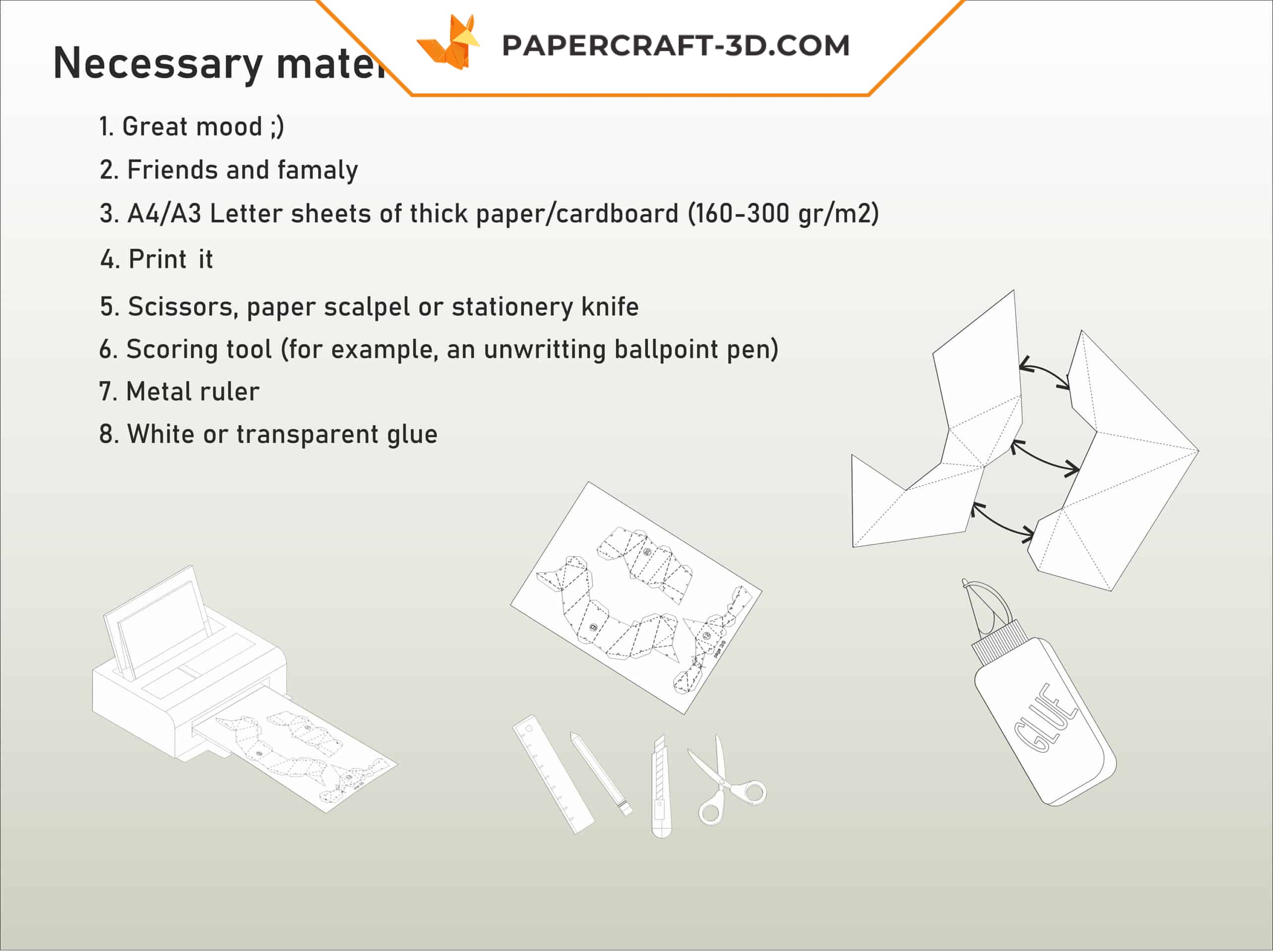 Le modèle terminé impressionne par ses dimensions généreuses : hauteur de 49 cm, largeur de 47 cm et profondeur de 60 cm. Conçu avec du papier A3 (160-300g), il se distingue par son design épuré qui met en valeur la complexité et la beauté de la forme.