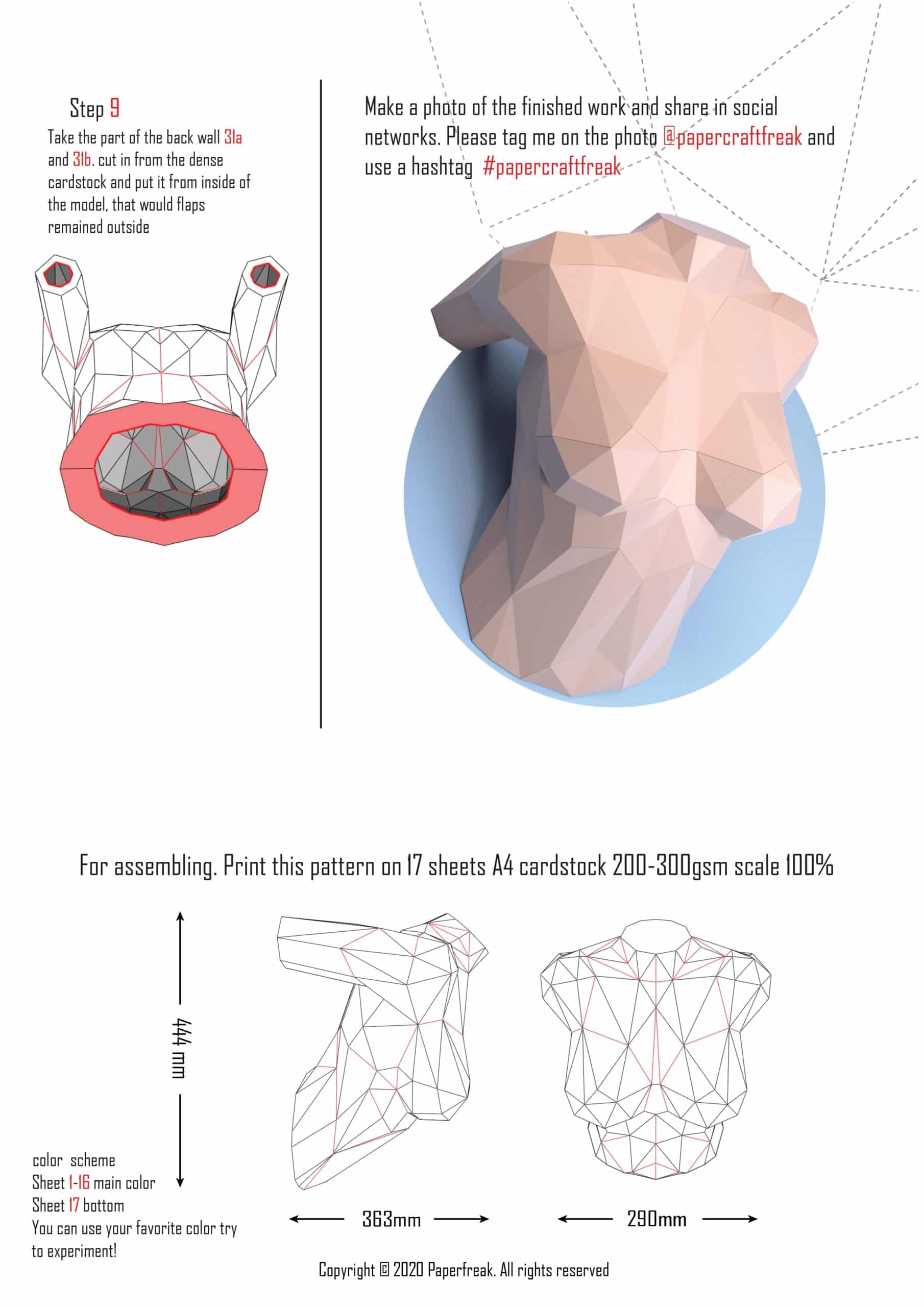 - Grande sculpture : une version murale composée de 17 feuilles de papier A4 ou lettre (250g-300g). Dimensions assemblées : Hauteur : 444 mm (17,5 pouces), Largeur : 290 mm (11,4 pouces), Profondeur : 363 mm (14,3 pouces).