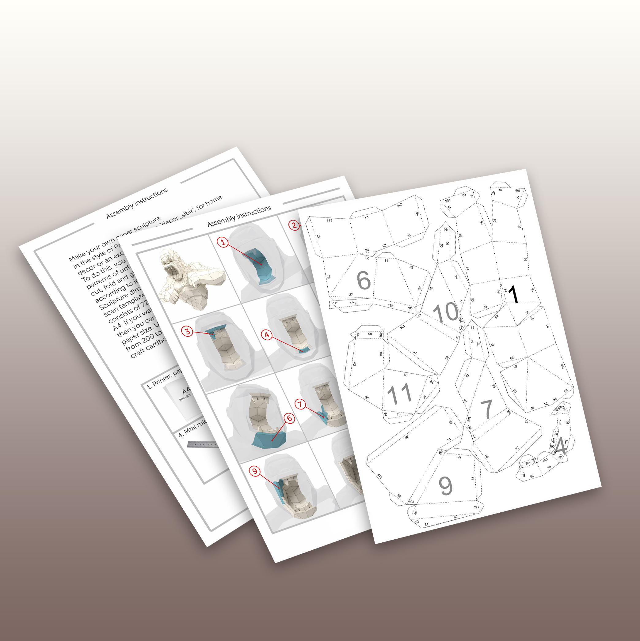 - Dimensions finales : 670 x 797 x 266 mm (hauteur x largeur x profondeur) si imprimé sur du papier A4.