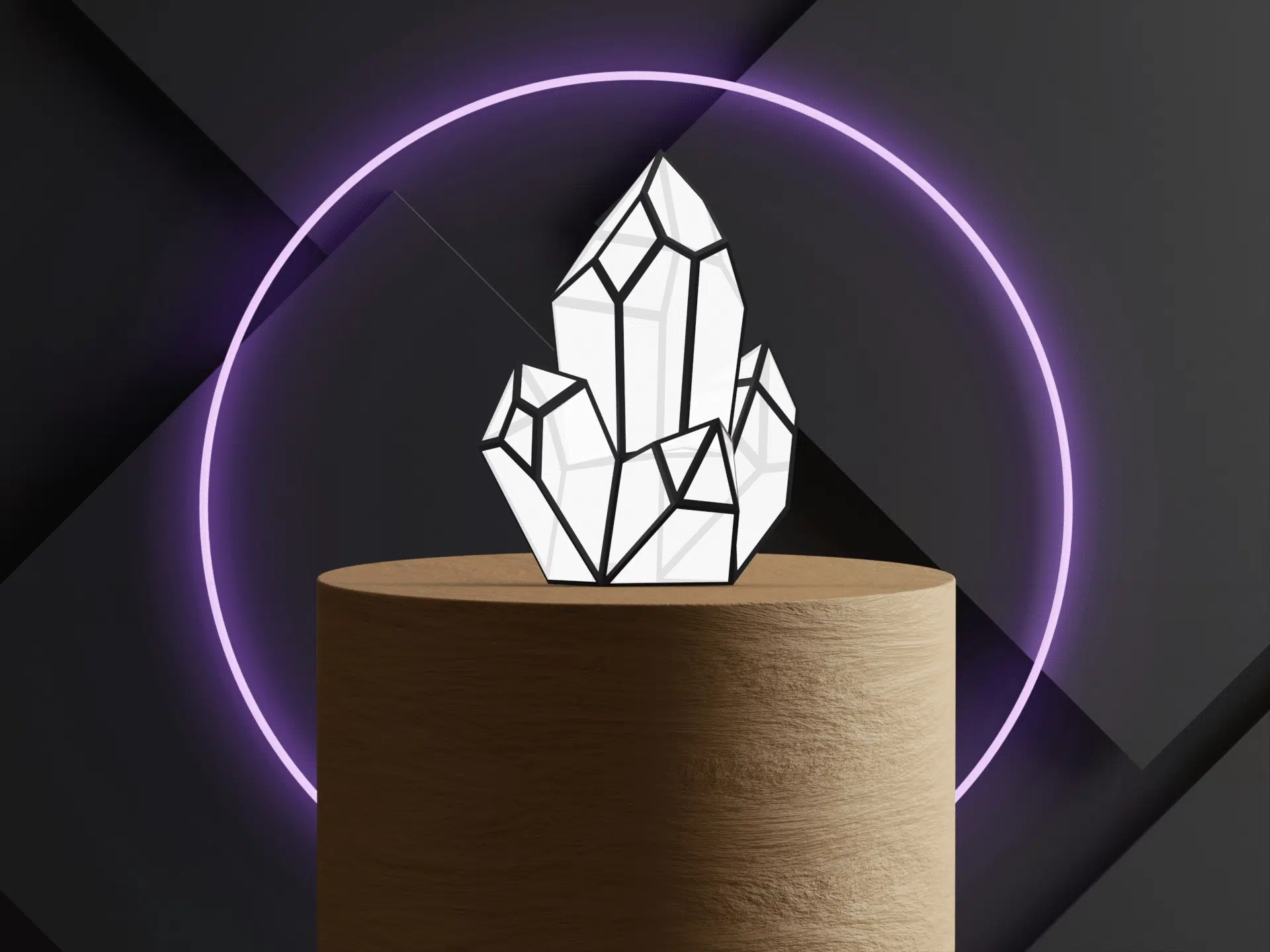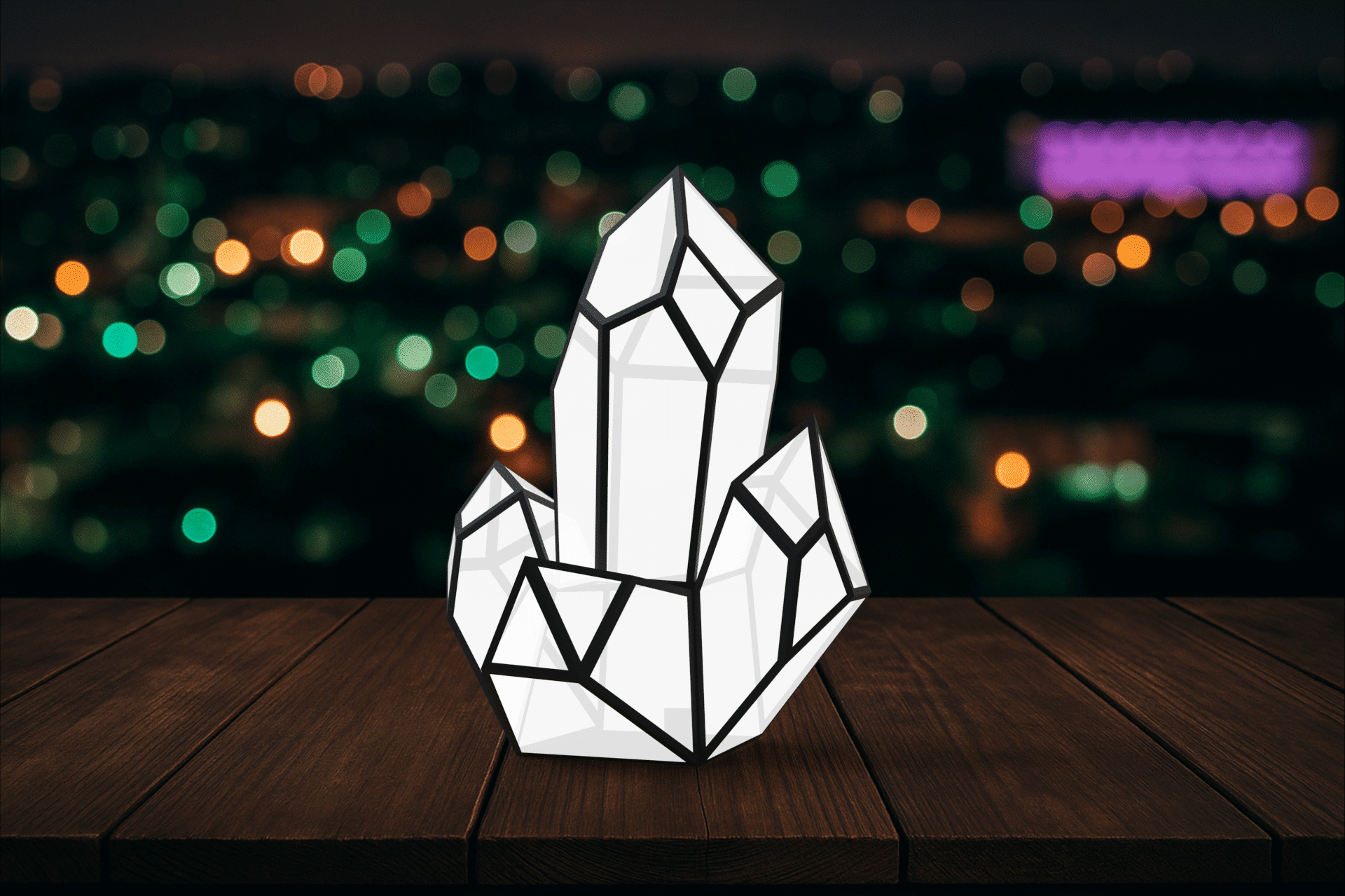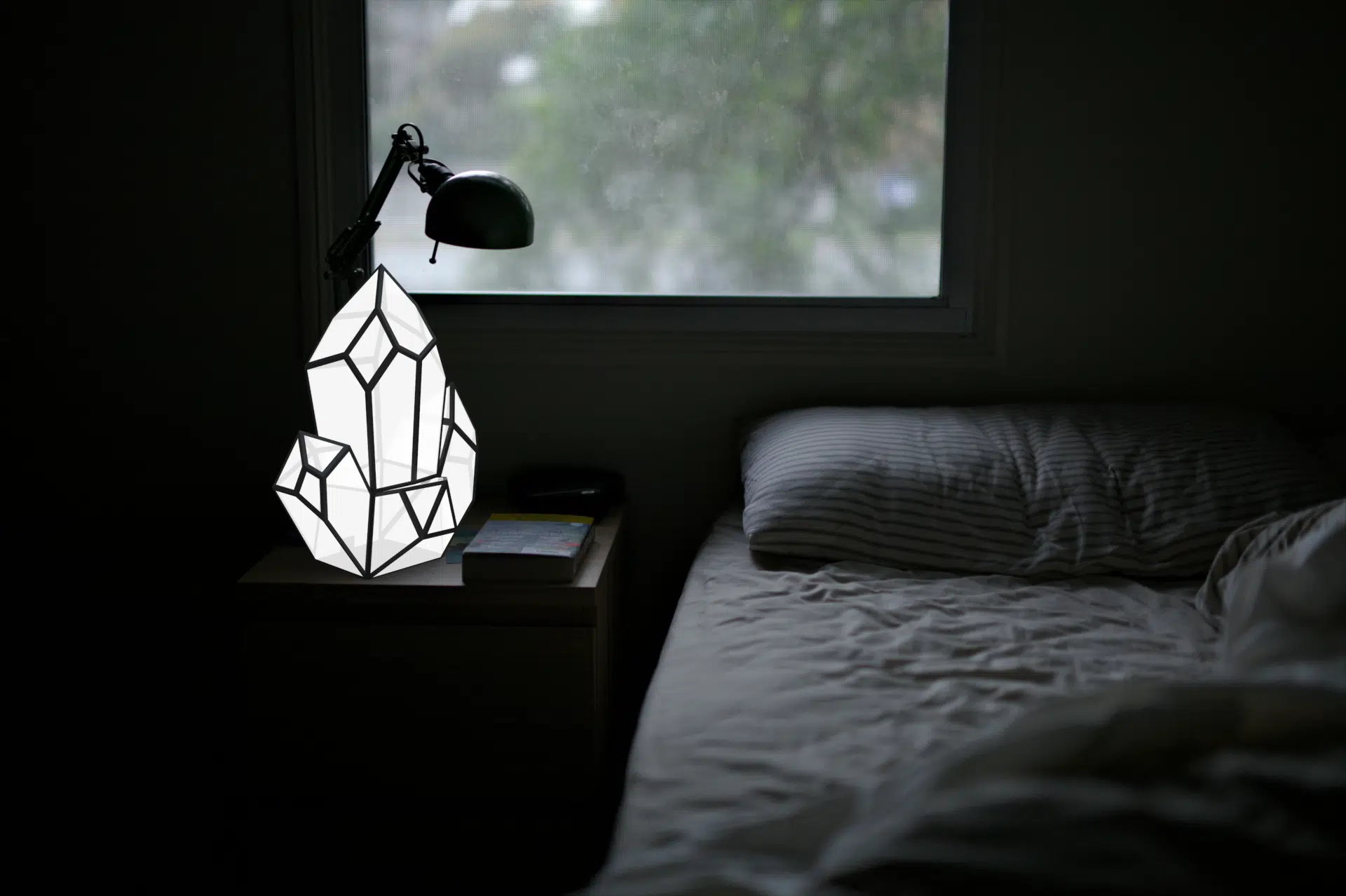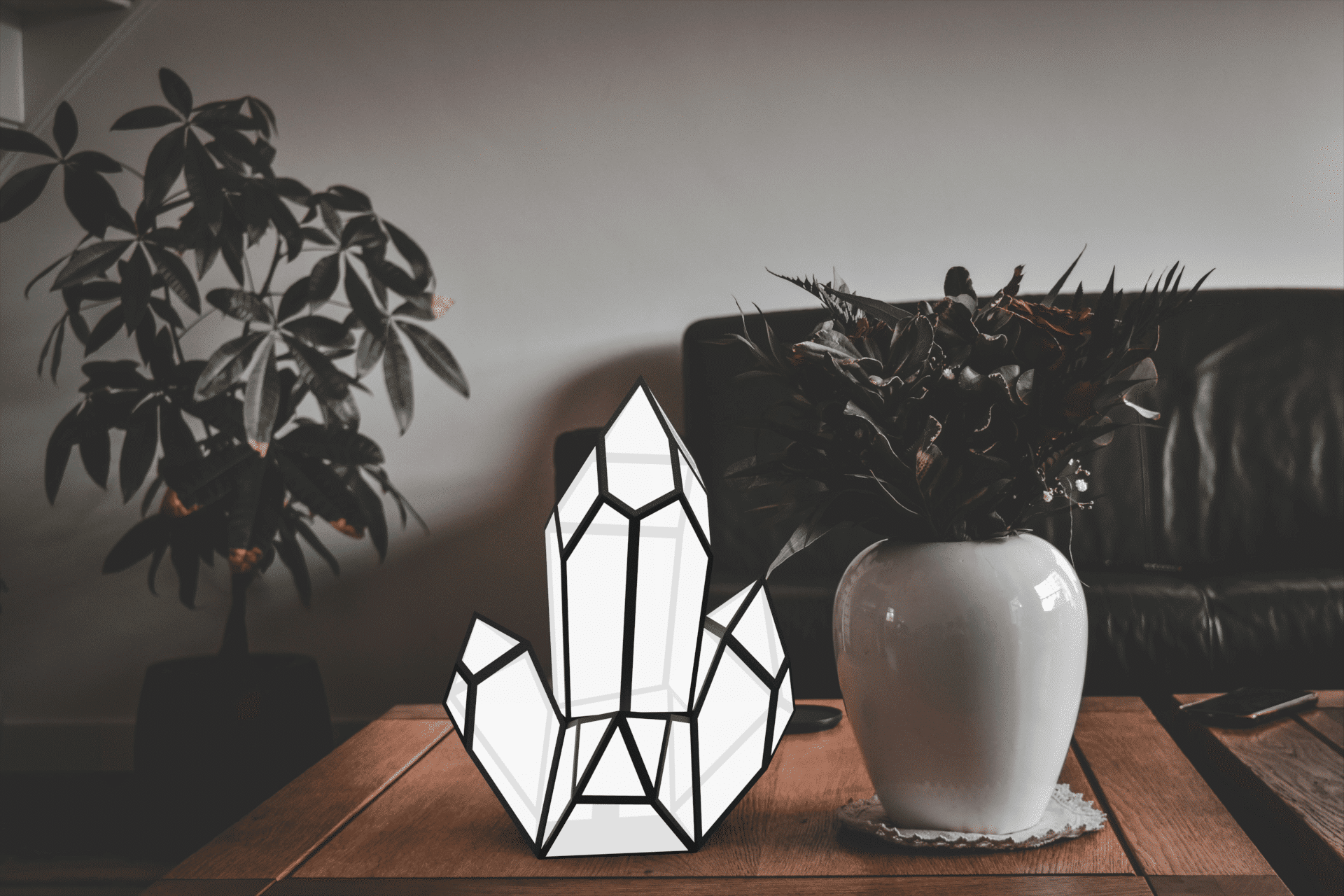 Une lampe low-poly inspirée des géodes : ses facettes nettes filtrent une lumière douce et homogène, idéale pour la table de chevet, un coin lecture ou une chambre d’enfant. Éteinte, elle garde un caractère sculptural et contemporain qui met en valeur votre décoration.