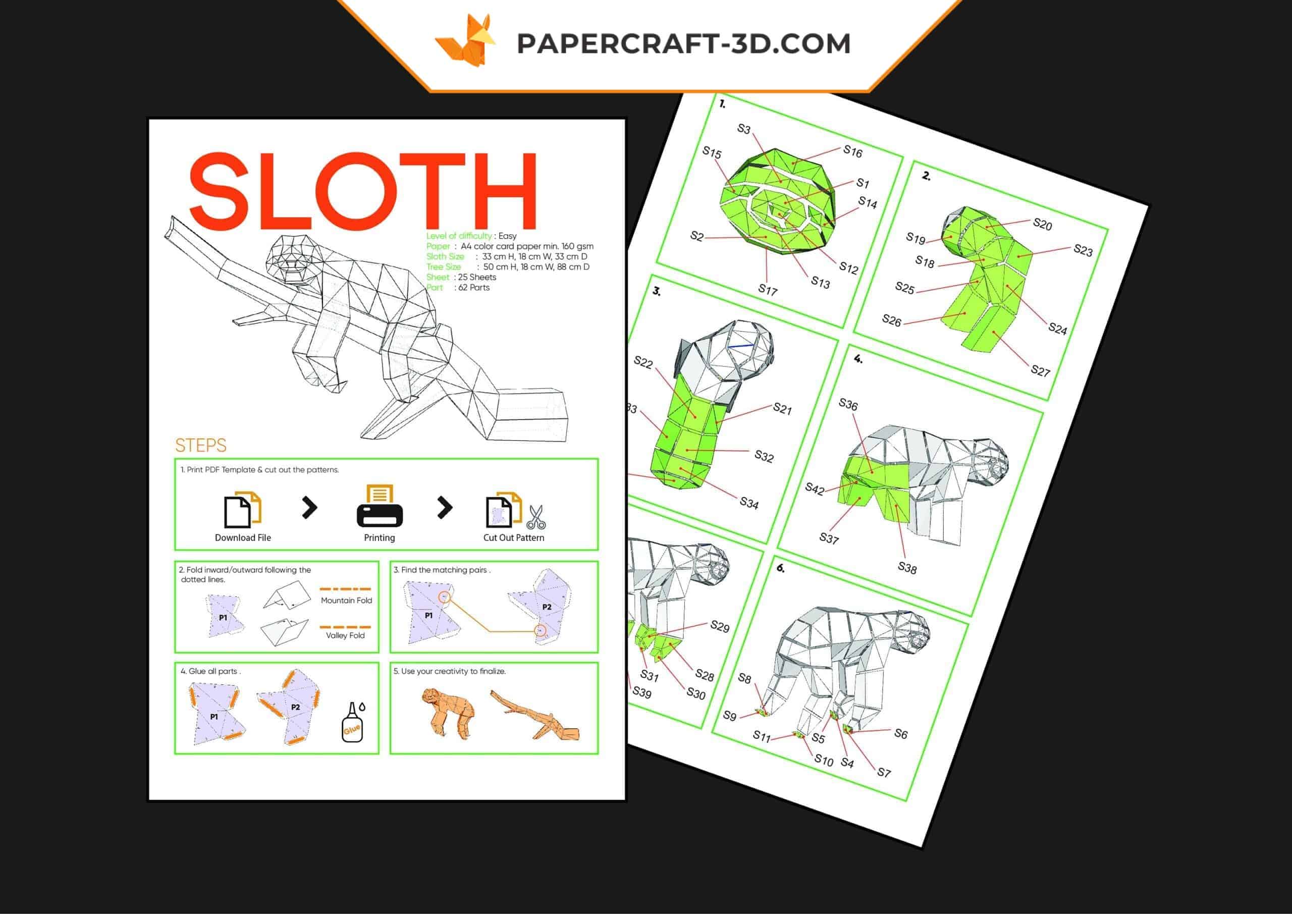 Características técnicas do papercraft bicho-preguiça em origami 3D