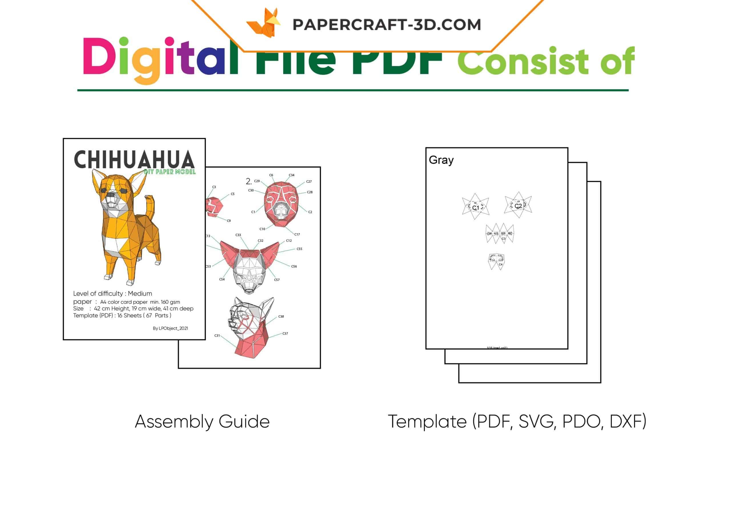 Chihuahua assis en papier à assembler : sculpture 3D de 330 x 235 x 290 mm. Patron comprenant 69 pièces, avec 8 pages en A3 ou 15 pages en A4. Niveau moyen, idéal pour un projet précis et gratifiant.