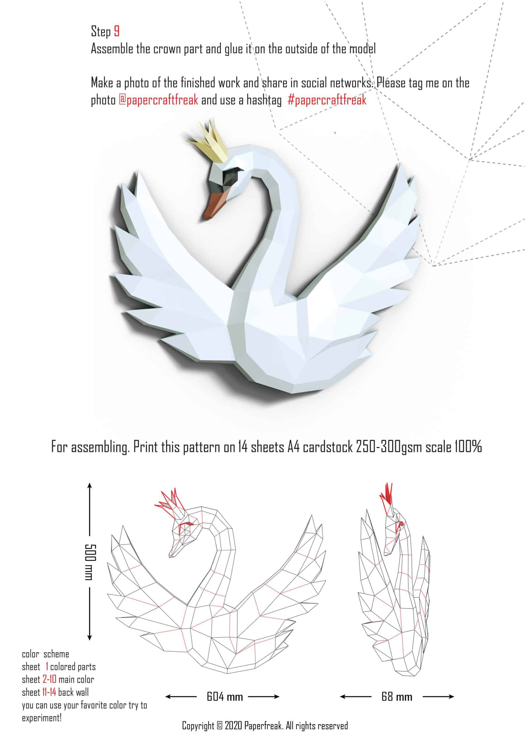 Características técnicas do papercraft cisne com coroa em origami 3D