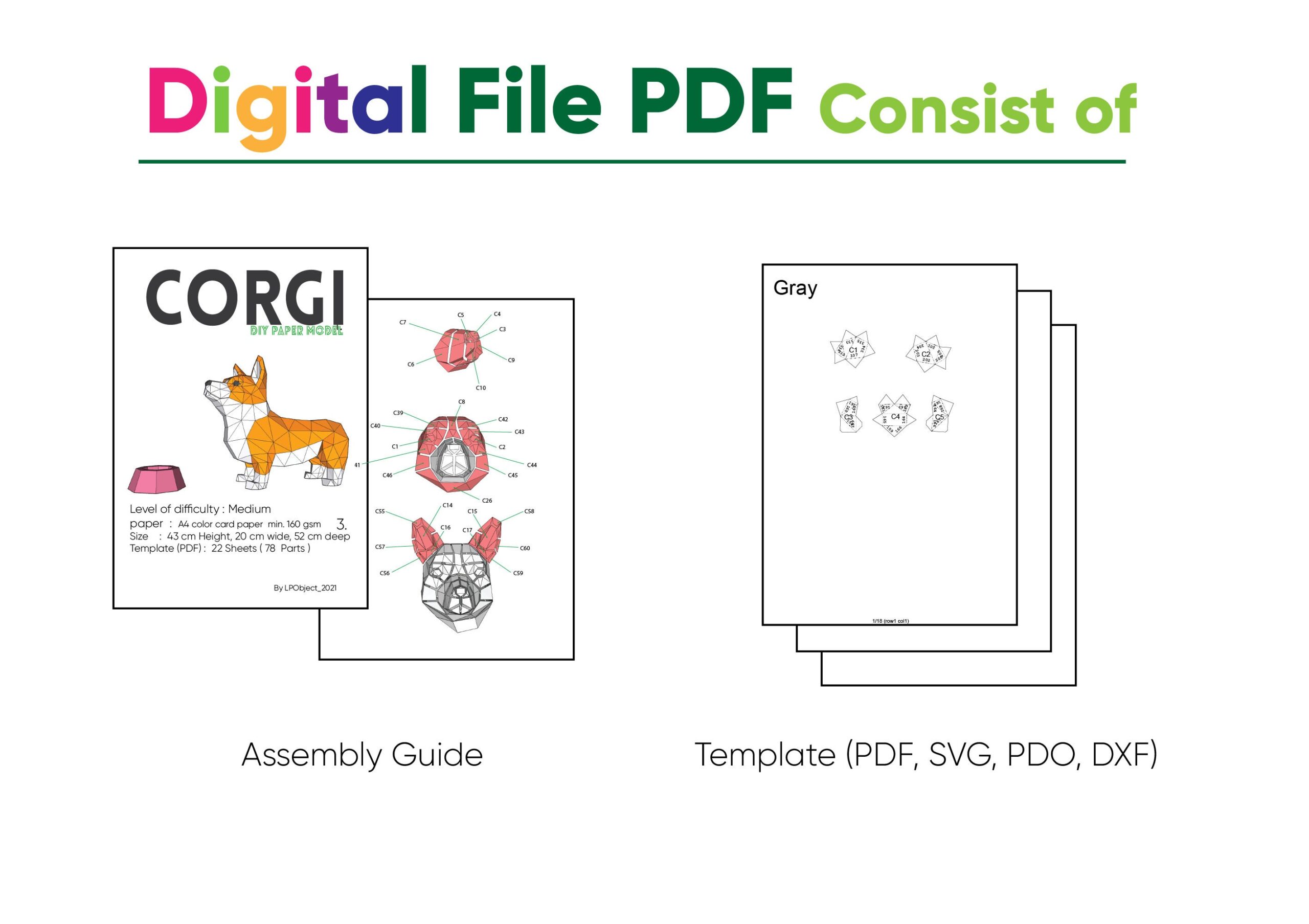 O papercraft de corgi em origami 3D está disponível em dois formatos: o kit digital (PDF para download imediato) ou a box completa com todas as folhas impressas e os acessórios necessários. Escolha o que melhor se adapta ao seu estilo de criação e comece agora mesmo seu projeto artístico.