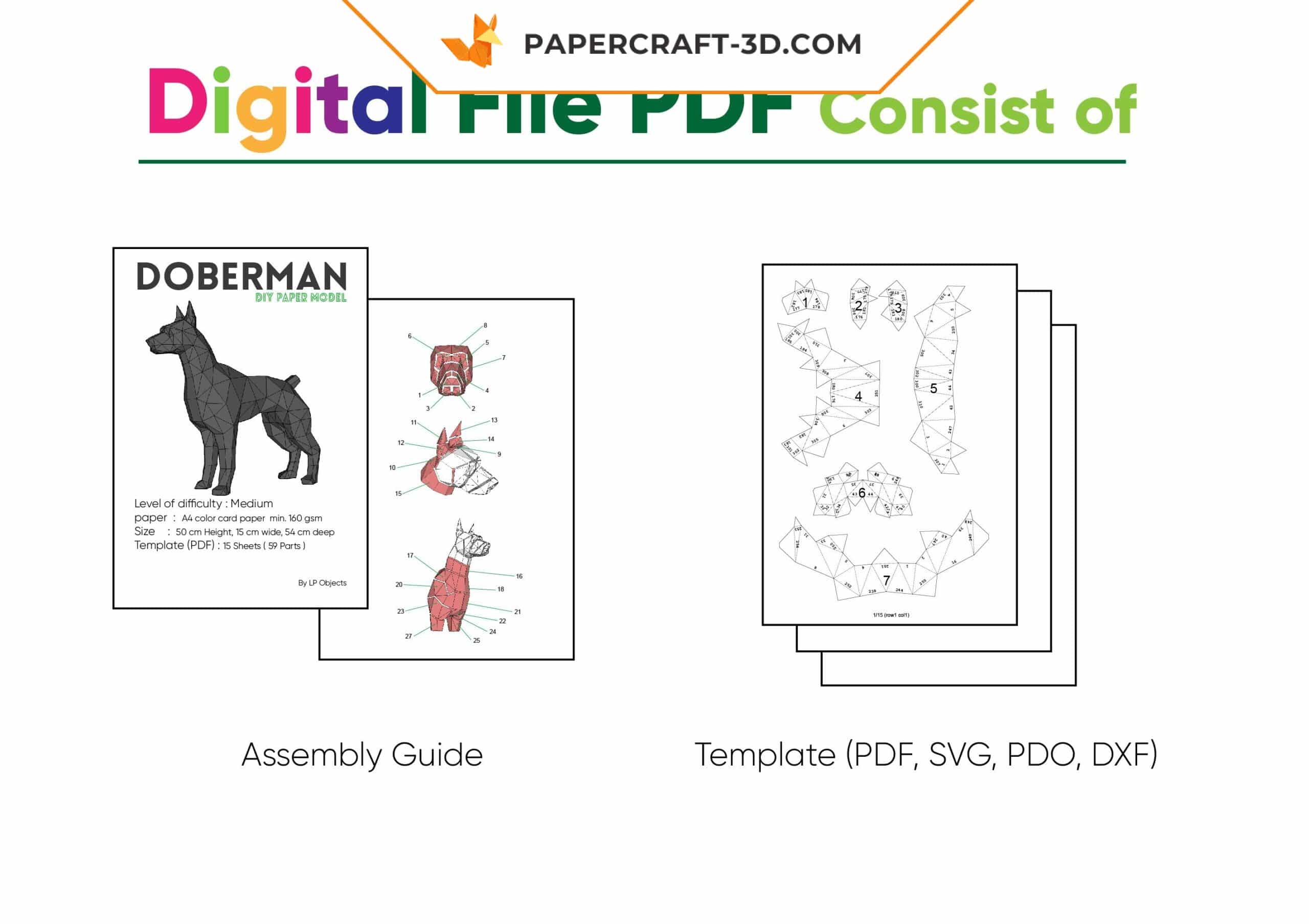 Uma noite tranquila, após um dia cheio, você se acomoda confortavelmente no seu espaço criativo. Diante de você, as peças delicadas do Doberman papercraft estão espalhadas, prontas para serem montadas. Com alguns gestos precisos, as formas poligonais ganham vida, transformando o papel em uma magnífica obra de arte. Este Doberman, com sua postura orgulhosa e elegante, torna-se o centro das atenções da sua decoração interior. Seja você um apaixonado por cães ou um amante de design único, este modelo é perfeito para você. Descubra mais modelos semelhantes em nossa coleção de papercraft de cães.