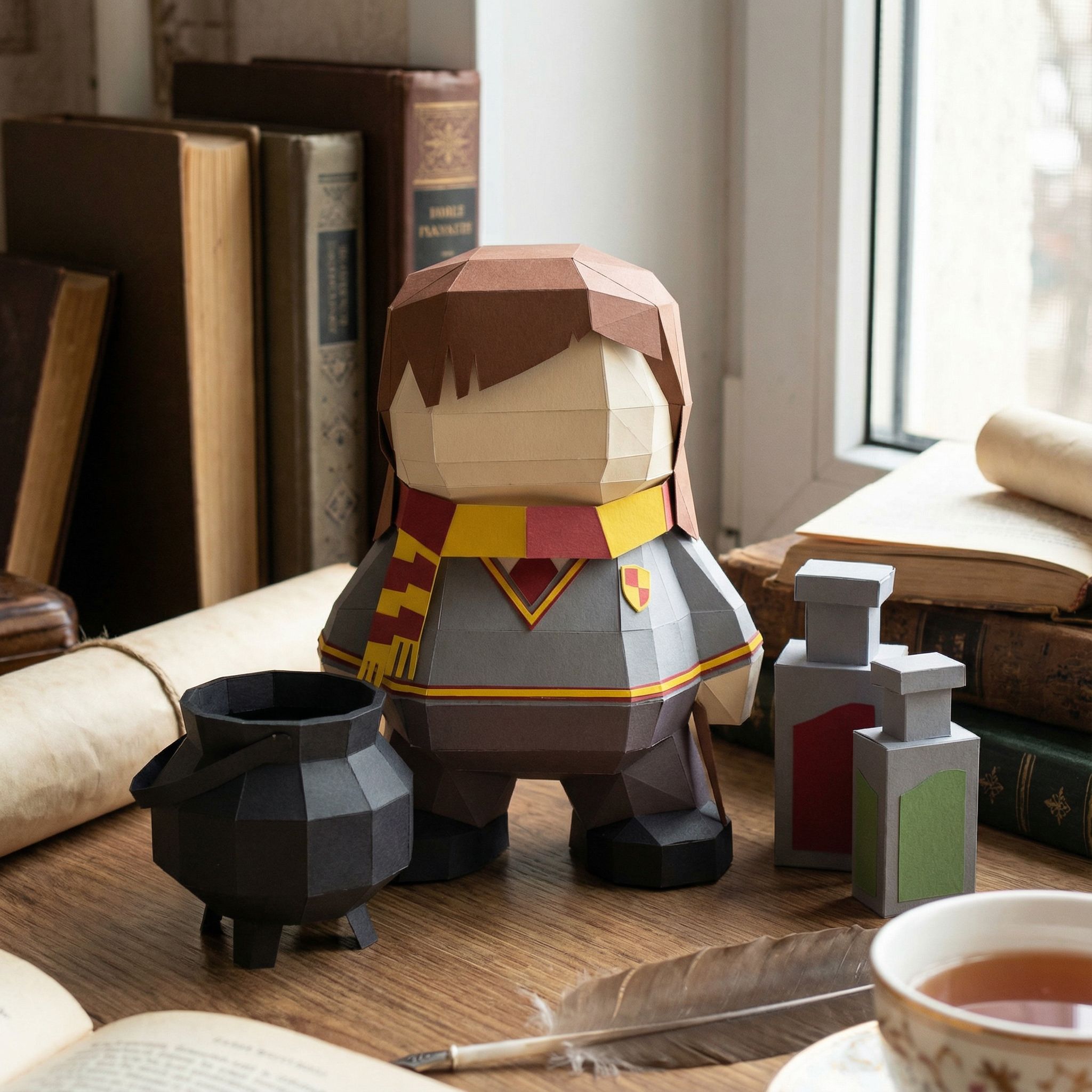 Tudo começa com algumas folhas de papel… e muito rapidamente, Hermione Granger surge, estudiosa, concentrada, pronta para lançar um feitiço ou folhear um grimório. Este modelo de origami 3D captura sua energia única, entre inteligência afiada e determinação tranquila. A cabeça móvel, o cachecol, o caldeirão e os frascos dão imediatamente mais profundidade à cena. Uma peça decorativa marcante, perfeita para um escritório, uma estante ou um cantinho criativo dedicado à saga.