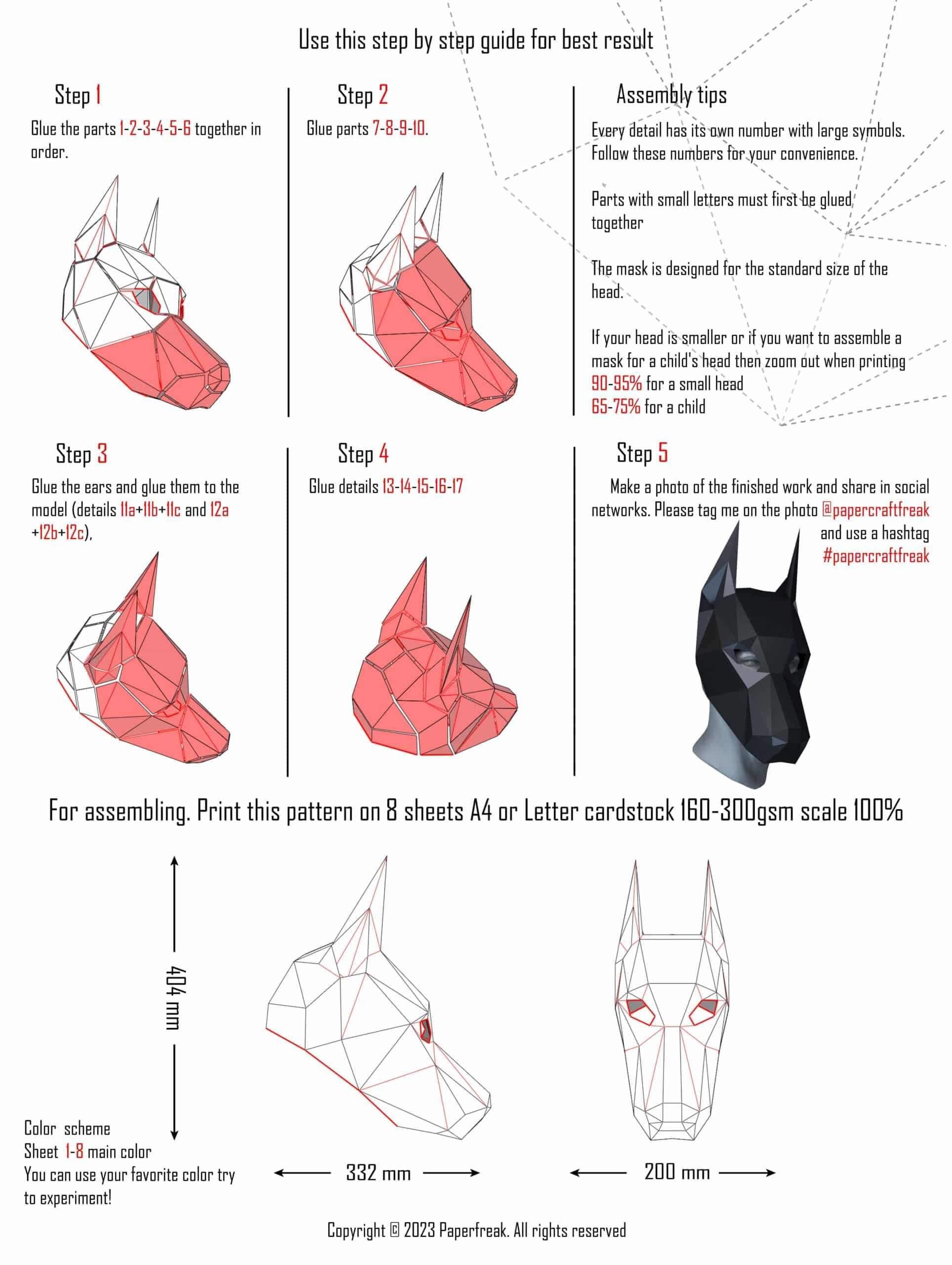 Não perca tempo e mergulhe nessa experiência criativa e única! Monte sua própria máscara capacete Doberman em papercraft 3D, compartilhe seu trabalho nas redes sociais com a hashtag #papercraftfreak e impressione a todos. Seja você um amante de artes manuais, um decorador em busca de peças exclusivas ou um fã da cultura pop, este modelo é perfeito para agregar personalidade às suas criações. Torne-se o destaque das festas com esta obra-prima feita por suas próprias mãos!