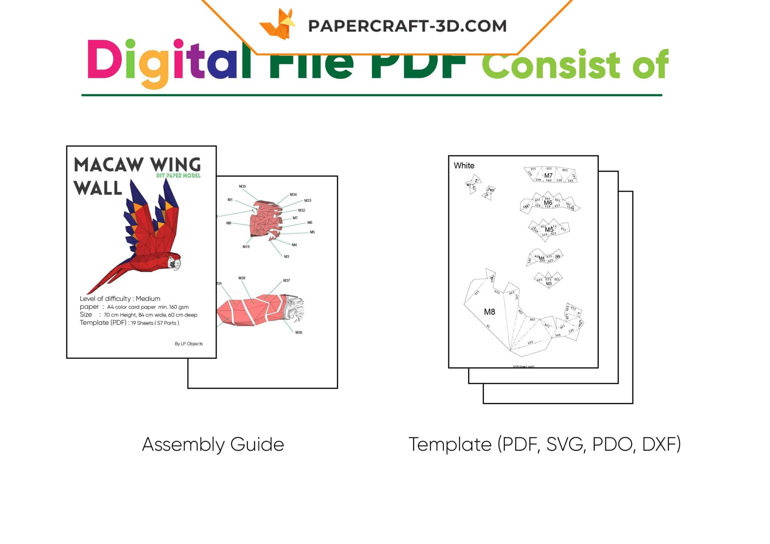 O papercraft asa de papagaio em origami está disponível em dois formatos: um kit digital (PDF para download) e uma caixa completa contendo todas as folhas impressas, bem como os acessórios necessários. Se você prefere imprimir em casa ou receber todo o material pronto para uso, este kit atenderá às suas expectativas e permitirá que você crie esta magnífica asa de papagaio Macaw.