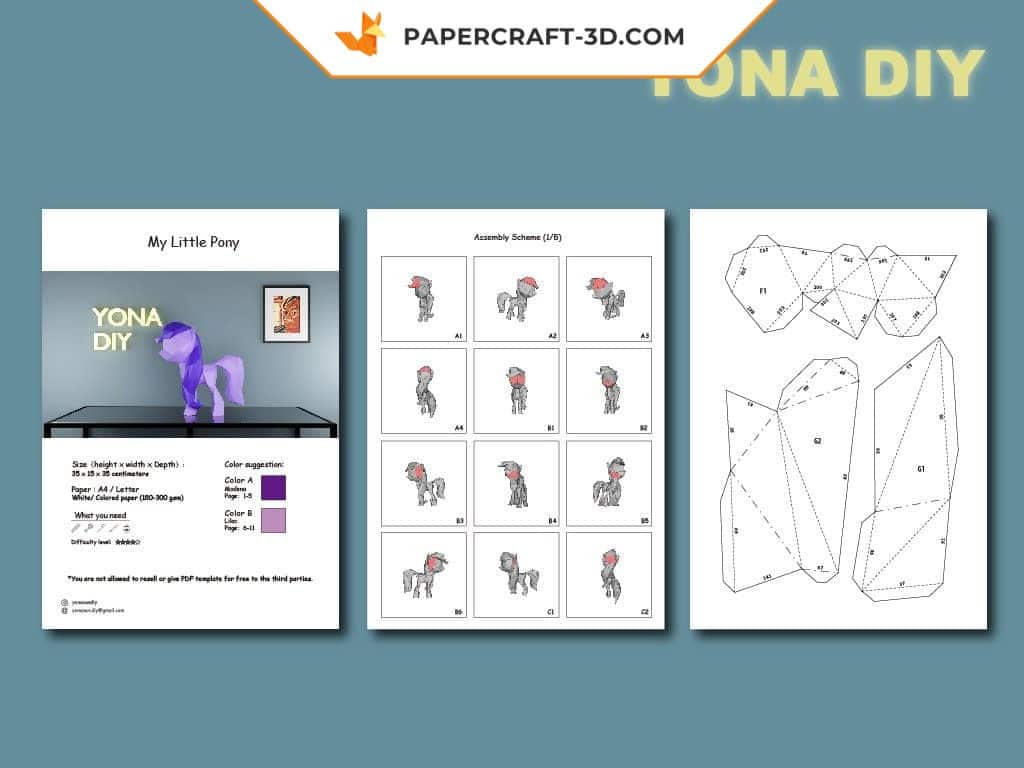 O papercraft de pequeno pônei em origami 3D mede precisamente 10,5 cm de altura, 22 cm de largura e 9 cm de profundidade. Projetado para ser feito com papel cartão colorido com gramatura entre 160g e 300g, é idealmente manuseável com gramatura entre 200g e 250g.