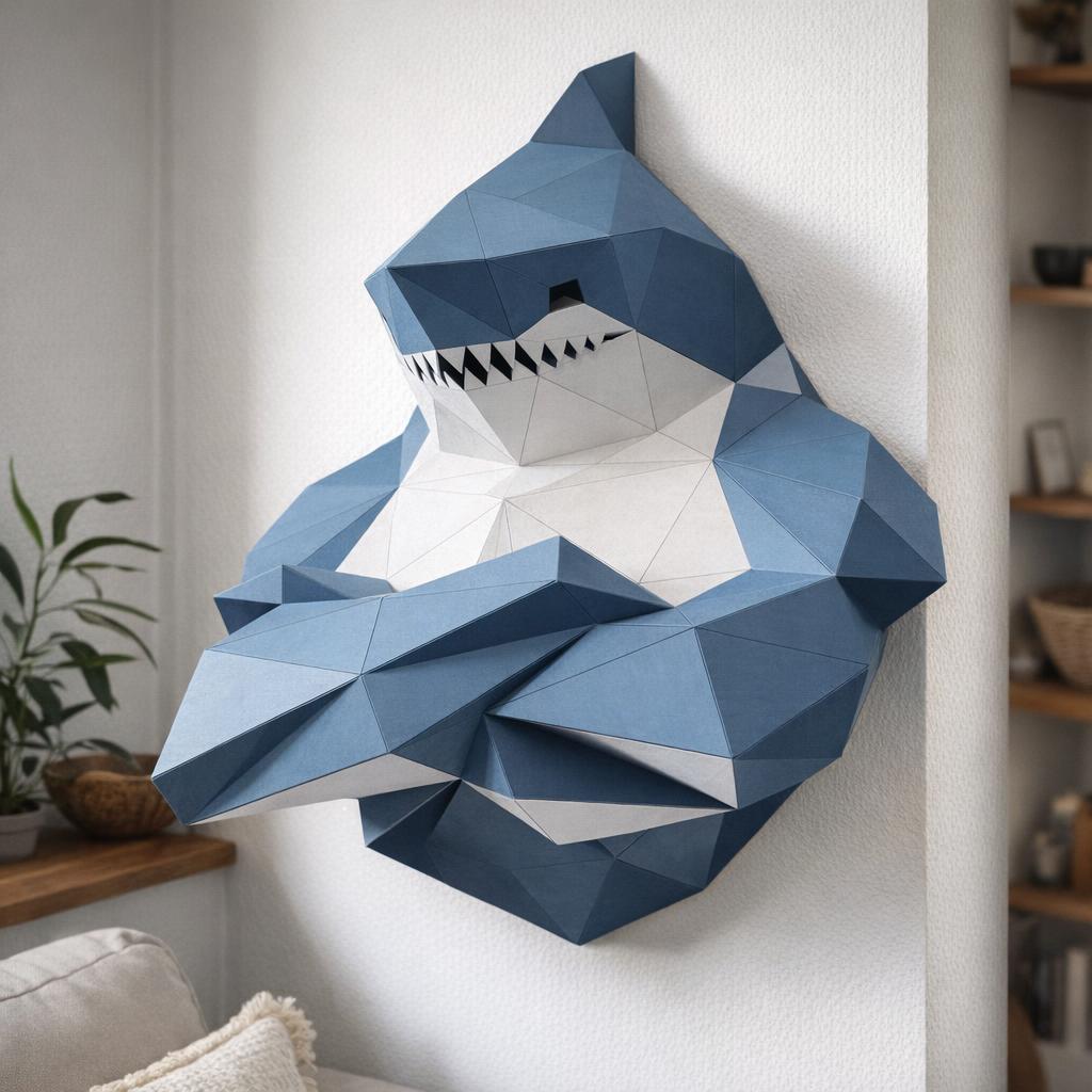 Imaginez-le surgir des profondeurs. Gueule entrouverte, regard perçant, lignes tendues. Ce buste de requin en origami 3D transforme un simple mur en scène océanique saisissante. Chaque pli compte, chaque pièce s’emboîte pour donner naissance à une sculpture murale puissante, presque vivante.